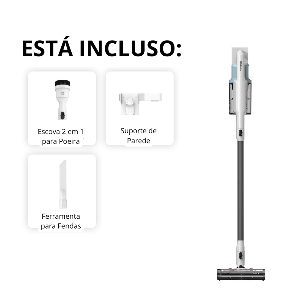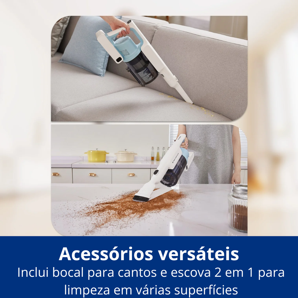 Versatilidade de uso: além do modo “stick” (vertical), transforma-se rapidamente em aspirador de mão — perfeito para sofás, estofados, cantos, escadas e cantos de difícil acesso.